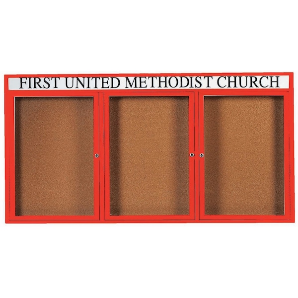 Illuminated Enclosed Aluminum Bulletin Boards are made of custom extruded parts engineered to provide accurate, durable and handsome cabinets. All corners are neatly mitered and assembled with Heavy duty reinforcements and fasteners. Back panel is natural pebble grain cork. Supplied with a blank header panel, ready for your custom vinyl lettering. Lettering is not included and must be applied by the customer. Red Powder Coated Finish Size 36"Hx72"W 3 Doors