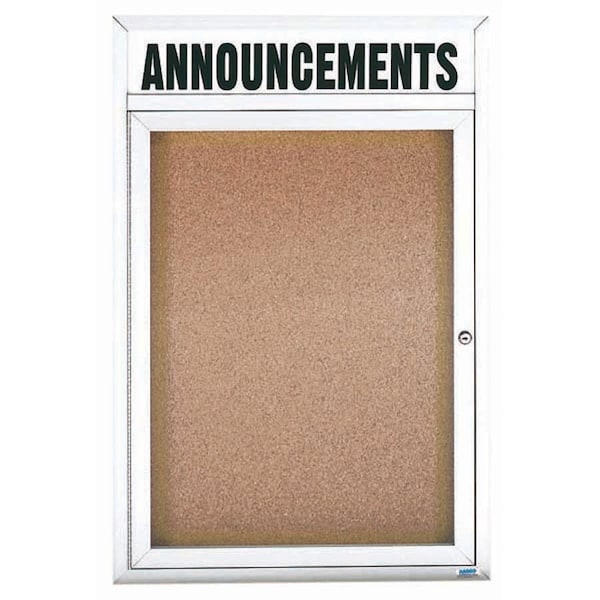 Illuminated Enclosed Aluminum Bulletin Boards are made of custom extruded parts engineered to provide accurate, durable and handsome cabinets. All corners are neatly mitered and assembled with Heavy duty reinforcements and fasteners. Back panel is natural pebble grain cork. Supplied with a blank header panel, ready for your custom vinyl lettering. Lettering is not included and must be applied by the customer. White Powder Coated Finish Size 36"Hx24"W 1 Door