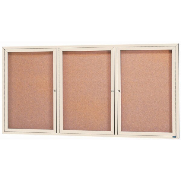Illuminated Enclosed Aluminum Bulletin Boards are made of custom extruded parts engineered to provide accurate, durable and handsome cabinets. All corners are neatly mitered and assembled with Heavy duty reinforcements and fasteners. Back panel is natural pebble grain cork. Ivory Powder Coated Finish Size 48"Hx96"W 3 Doors