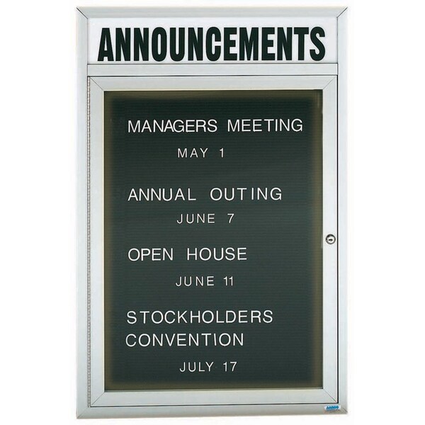 Illuminated Enclosed Aluminum Directory Boards are made of custom extruded parts engineered to provide accurate, durable and handsome cabinets. All corners are neatly mitered and assembled with Heavy duty reinforcements and fasteners. The black felt covered grooved rear panel designed to accommodate changeable letters with tabs spaced on 1/4" centers. Supplied with a blank header panel, ready for your custom vinyl lettering. Lettering is not included and must be applied by the customer. Finish Clear Satin Anodized Size 36"Hx24"W 1 Door