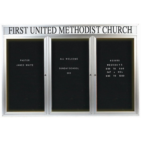 Illuminated Enclosed Aluminum Directory Boards are made of custom extruded parts engineered to provide accurate, durable and handsome cabinets. All corners are neatly mitered and assembled with Heavy duty reinforcements and fasteners. The black felt covered grooved rear panel designed to accommodate changeable letters with tabs spaced on 1/4" centers. Supplied with a blank header panel, ready for your custom vinyl lettering. Lettering is not included and must be applied by the customer. Finish Clear Satin Anodized Size 48"Hx72"W 3 Doors