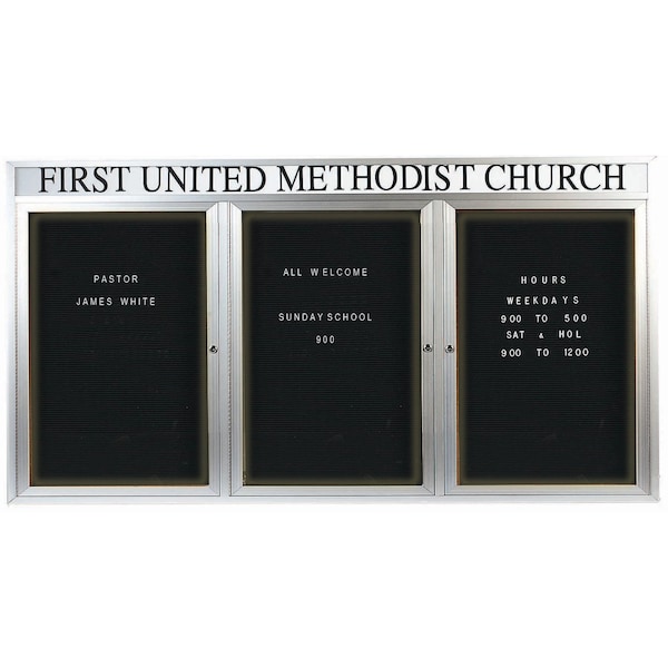 Illuminated Enclosed Aluminum Directory Boards are made of custom extruded parts engineered to provide accurate, durable and handsome cabinets. All corners are neatly mitered and assembled with Heavy duty reinforcements and fasteners. The black felt covered grooved rear panel designed to accommodate changeable letters with tabs spaced on 1/4" centers. Supplied with a blank header panel, ready for your custom vinyl lettering. Lettering is not included and must be applied by the customer. Finish Clear Satin Anodized Size 36"Hx72"W 3 Doors