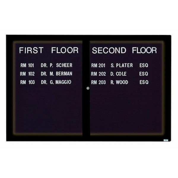Illuminated Enclosed Letter Board Directory w/ Powder Coated Black Al Frame, 48''Hx72''W 2 Doors