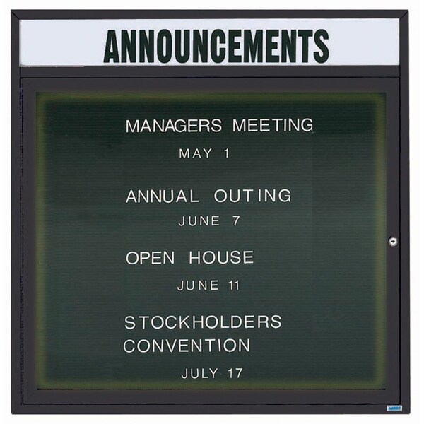 Illuminated Enclosed Aluminum Directory Boards are made of custom extruded parts engineered to provide accurate, durable and handsome cabinets. All corners are neatly mitered and assembled with Heavy duty reinforcements and fasteners. The black felt covered grooved rear panel designed to accommodate changeable letters with tabs spaced on 1/4" centers. Supplied with a blank header panel, ready for your custom vinyl lettering. Lettering is not included and must be applied by the customer. Black Powder Coated Finish Size 36"Hx36"W 1 Door