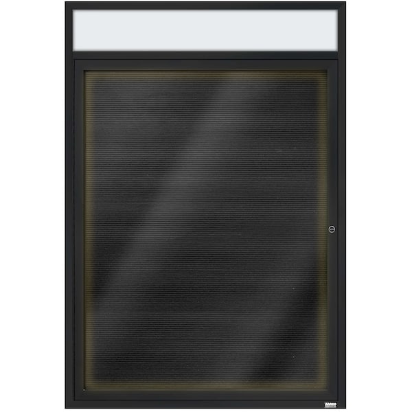 Illuminated Enclosed Aluminum Directory Boards are made of custom extruded parts engineered to provide accurate, durable and handsome cabinets. All corners are neatly mitered and assembled with Heavy duty reinforcements and fasteners. The black felt covered grooved rear panel designed to accommodate changeable letters with tabs spaced on 1/4" centers. Supplied with a blank header panel, ready for your custom vinyl lettering. Lettering is not included and must be applied by the customer. Black Powder Coated Finish Size 48"Hx36"W 1 Door