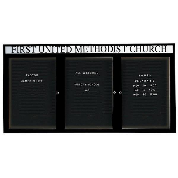 Illuminated Enclosed Aluminum Directory Boards are made of custom extruded parts engineered to provide accurate, durable and handsome cabinets. All corners are neatly mitered and assembled with Heavy duty reinforcements and fasteners. The black felt covered grooved rear panel designed to accommodate changeable letters with tabs spaced on 1/4" centers. Supplied with a blank header panel, ready for your custom vinyl lettering. Lettering is not included and must be applied by the customer. Black Powder Coated Finish Size 48"Hx96"W 3 Doors
