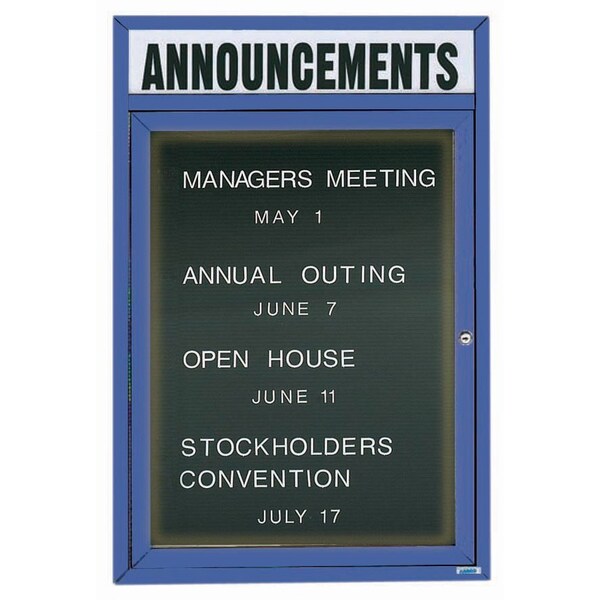 Illuminated Enclosed Aluminum Directory Boards are made of custom extruded parts engineered to provide accurate, durable and handsome cabinets. All corners are neatly mitered and assembled with Heavy duty reinforcements and fasteners. The black felt covered grooved rear panel designed to accommodate changeable letters with tabs spaced on 1/4" centers. Supplied with a blank header panel, ready for your custom vinyl lettering. Lettering is not included and must be applied by the customer. Blue Powder Coated Finish Size 36"Hx24"W 1 Door