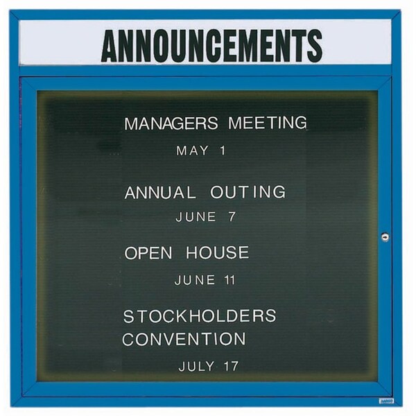 Illuminated Enclosed Aluminum Directory Boards are made of custom extruded parts engineered to provide accurate, durable and handsome cabinets. All corners are neatly mitered and assembled with Heavy duty reinforcements and fasteners. The black felt covered grooved rear panel designed to accommodate changeable letters with tabs spaced on 1/4" centers. Supplied with a blank header panel, ready for your custom vinyl lettering. Lettering is not included and must be applied by the customer. Blue Powder Coated Finish Size 36"Hx36"W 1 Door