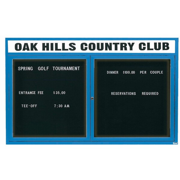 Illuminated Enclosed Aluminum Directory Boards are made of custom extruded parts engineered to provide accurate, durable and handsome cabinets. All corners are neatly mitered and assembled with Heavy duty reinforcements and fasteners. The black felt covered grooved rear panel designed to accommodate changeable letters with tabs spaced on 1/4" centers. Supplied with a blank header panel, ready for your custom vinyl lettering. Lettering is not included and must be applied by the customer. Blue Powder Coated Finish Size 36"Hx60"W 2 Doors