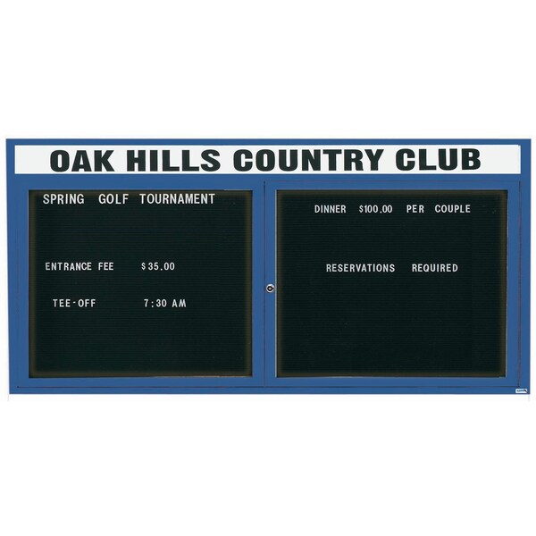 Illuminated Enclosed Aluminum Directory Boards are made of custom extruded parts engineered to provide accurate, durable and handsome cabinets. All corners are neatly mitered and assembled with Heavy duty reinforcements and fasteners. The black felt covered grooved rear panel designed to accommodate changeable letters with tabs spaced on 1/4" centers. Supplied with a blank header panel, ready for your custom vinyl lettering. Lettering is not included and must be applied by the customer. Blue Powder Coated Finish Size 36"Hx72"W 2 Doors