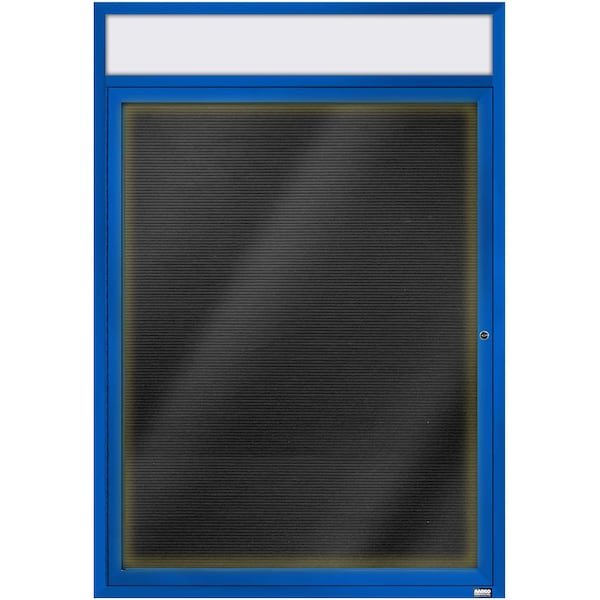Illuminated Enclosed Aluminum Directory Boards are made of custom extruded parts engineered to provide accurate, durable and handsome cabinets. All corners are neatly mitered and assembled with Heavy duty reinforcements and fasteners. The black felt covered grooved rear panel designed to accommodate changeable letters with tabs spaced on 1/4" centers. Supplied with a blank header panel, ready for your custom vinyl lettering. Lettering is not included and must be applied by the customer. Blue Powder Coated Finish Size 48"Hx36"W 1 Door