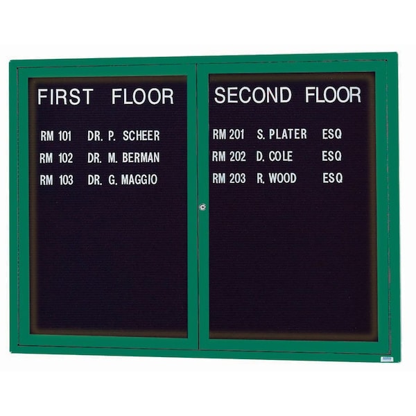 Illuminated Enclosed Aluminum Directory Boards are made of custom extruded parts engineered to provide accurate, durable and handsome cabinets. All corners are neatly mitered and assembled with Heavy duty reinforcements and fasteners. The black felt covered grooved rear panel designed to accommodate changeable letters with tabs spaced on 1/4" centers. Green Powder Coated Finish Size 36"Hx48"W 2 Doors