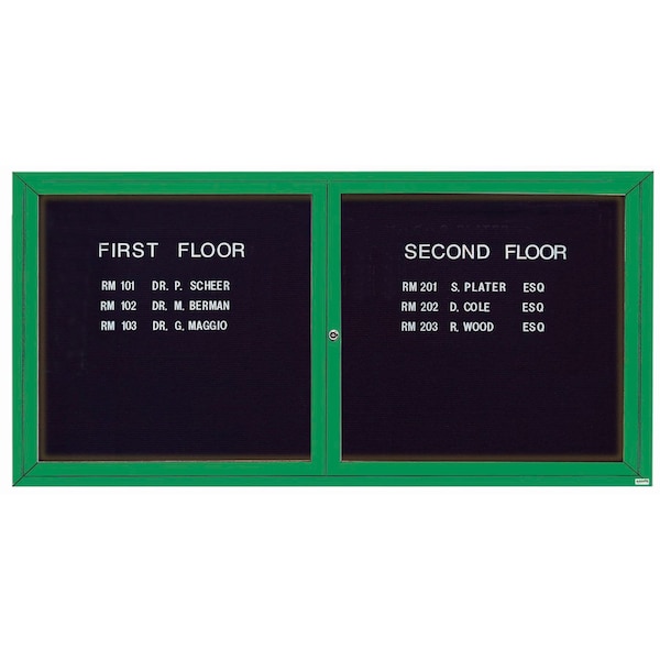 Illuminated Enclosed Aluminum Directory Boards are made of custom extruded parts engineered to provide accurate, durable and handsome cabinets. All corners are neatly mitered and assembled with Heavy duty reinforcements and fasteners. The black felt covered grooved rear panel designed to accommodate changeable letters with tabs spaced on 1/4" centers. Green Powder Coated Finish Size 36"Hx72"W 2 Doors