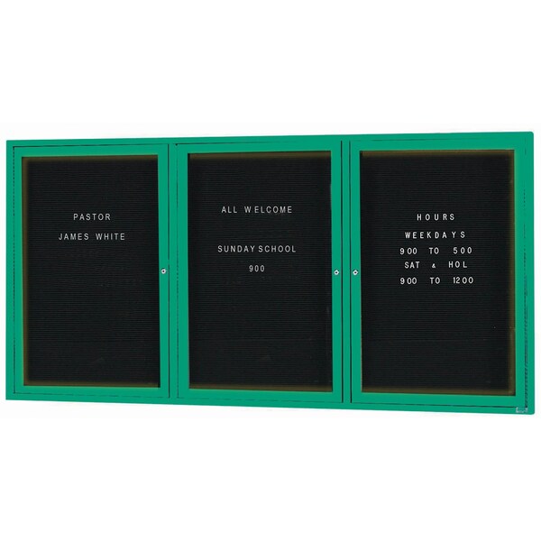Illuminated Enclosed Aluminum Directory Boards are made of custom extruded parts engineered to provide accurate, durable and handsome cabinets. All corners are neatly mitered and assembled with Heavy duty reinforcements and fasteners. The black felt covered grooved rear panel designed to accommodate changeable letters with tabs spaced on 1/4" centers. Green Powder Coated Finish Size 36"Hx72"W 3 Doors