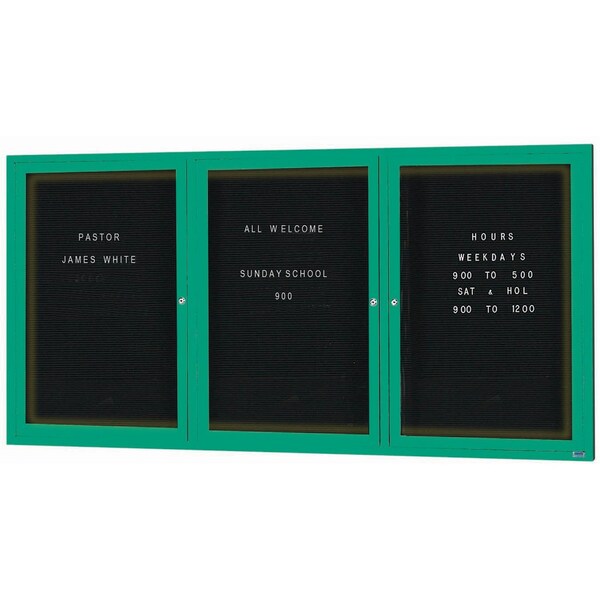 Illuminated Enclosed Aluminum Directory Boards are made of custom extruded parts engineered to provide accurate, durable and handsome cabinets. All corners are neatly mitered and assembled with Heavy duty reinforcements and fasteners. The black felt covered grooved rear panel designed to accommodate changeable letters with tabs spaced on 1/4" centers. Green Powder Coated Finish Size 48"Hx96"W 3 Doors