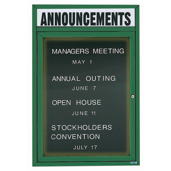 Illuminated Enclosed Aluminum Directory Boards are made of custom extruded parts engineered to provide accurate, durable and handsome cabinets. All corners are neatly mitered and assembled with Heavy duty reinforcements and fasteners. The black felt covered grooved rear panel designed to accommodate changeable letters with tabs spaced on 1/4" centers. Supplied with a blank header panel, ready for your custom vinyl lettering. Lettering is not included and must be applied by the customer. Green Powder Coated Finish Size 36"Hx24"W 1 Door
