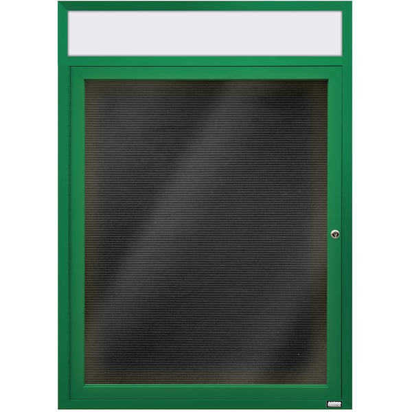 Illuminated Enclosed Aluminum Directory Boards are made of custom extruded parts engineered to provide accurate, durable and handsome cabinets. All corners are neatly mitered and assembled with Heavy duty reinforcements and fasteners. The black felt covered grooved rear panel designed to accommodate changeable letters with tabs spaced on 1/4" centers. Supplied with a blank header panel, ready for your custom vinyl lettering. Lettering is not included and must be applied by the customer. Green Powder Coated Finish Size 36"Hx30"W 1 Door