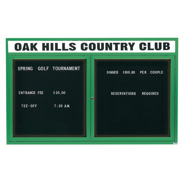Illuminated Enclosed Aluminum Directory Boards are made of custom extruded parts engineered to provide accurate, durable and handsome cabinets. All corners are neatly mitered and assembled with Heavy duty reinforcements and fasteners. The black felt covered grooved rear panel designed to accommodate changeable letters with tabs spaced on 1/4" centers. Supplied with a blank header panel, ready for your custom vinyl lettering. Lettering is not included and must be applied by the customer. Green Powder Coated Finish Size 36"Hx60"W 2 Doors