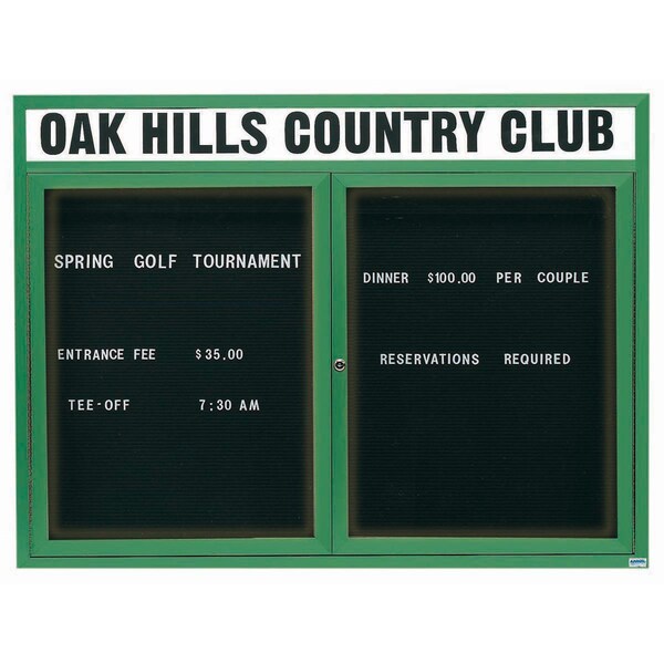 Illuminated Enclosed Aluminum Directory Boards are made of custom extruded parts engineered to provide accurate, durable and handsome cabinets. All corners are neatly mitered and assembled with Heavy duty reinforcements and fasteners. The black felt covered grooved rear panel designed to accommodate changeable letters with tabs spaced on 1/4" centers. Supplied with a blank header panel, ready for your custom vinyl lettering. Lettering is not included and must be applied by the customer. Green Powder Coated Finish Size 48"Hx60"W 2 Doors