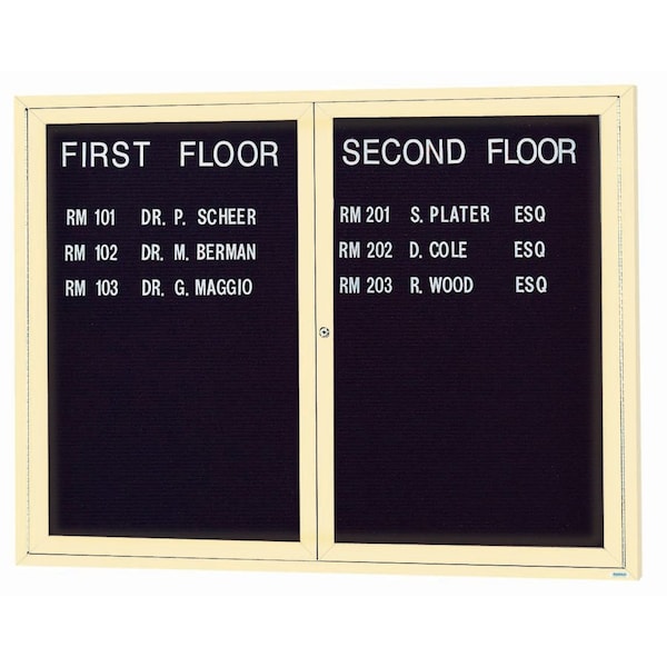 Illuminated Enclosed Aluminum Directory Boards are made of custom extruded parts engineered to provide accurate, durable and handsome cabinets. All corners are neatly mitered and assembled with Heavy duty reinforcements and fasteners. The black felt covered grooved rear panel designed to accommodate changeable letters with tabs spaced on 1/4" centers. Ivory Powder Coated Finish Size 36"Hx48"W 2 Doors