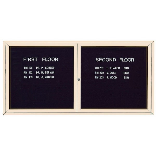 Illuminated Enclosed Aluminum Directory Boards are made of custom extruded parts engineered to provide accurate, durable and handsome cabinets. All corners are neatly mitered and assembled with Heavy duty reinforcements and fasteners. The black felt covered grooved rear panel designed to accommodate changeable letters with tabs spaced on 1/4" centers. Ivory Powder Coated Finish Size 36"Hx72"W 2 Doors