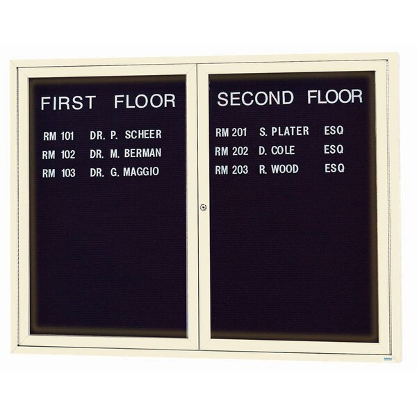 Illuminated Enclosed Aluminum Directory Boards are made of custom extruded parts engineered to provide accurate, durable and handsome cabinets. All corners are neatly mitered and assembled with Heavy duty reinforcements and fasteners. The black felt covered grooved rear panel designed to accommodate changeable letters with tabs spaced on 1/4" centers. Ivory Powder Coated Finish Size 48"Hx60"W 2 Doors