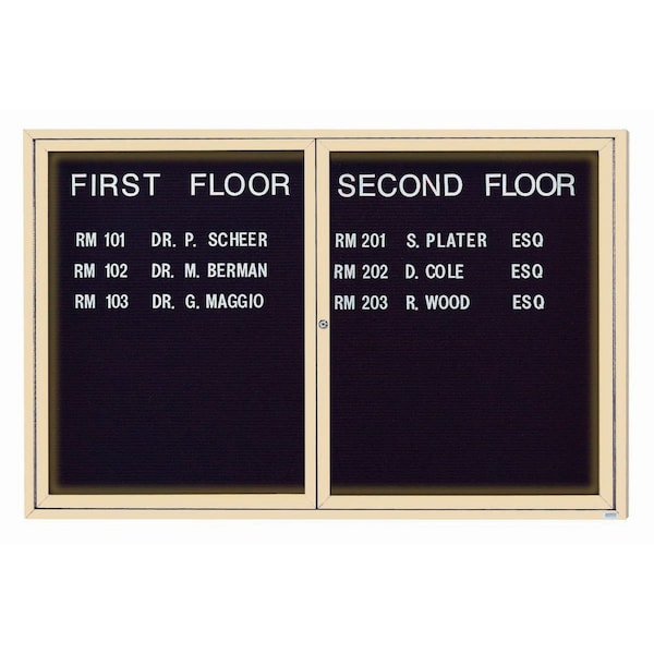 Illuminated Enclosed Aluminum Directory Boards are made of custom extruded parts engineered to provide accurate, durable and handsome cabinets. All corners are neatly mitered and assembled with Heavy duty reinforcements and fasteners. The black felt covered grooved rear panel designed to accommodate changeable letters with tabs spaced on 1/4" centers.. Ivory Powder Coated Finish Size 48"Hx72"W 2 Doors
