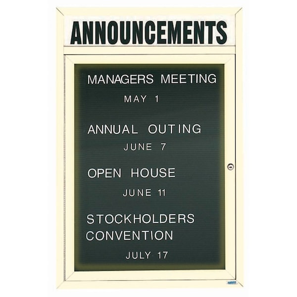 Illuminated Enclosed Aluminum Directory Boards are made of custom extruded parts engineered to provide accurate, durable and handsome cabinets. All corners are neatly mitered and assembled with Heavy duty reinforcements and fasteners. The black felt covered grooved rear panel designed to accommodate changeable letters with tabs spaced on 1/4" centers. Supplied with a blank header panel, ready for your custom vinyl lettering. Lettering is not included and must be applied by the customer. Ivory Powder Coated Finish Size 36"Hx24"W 1 Door