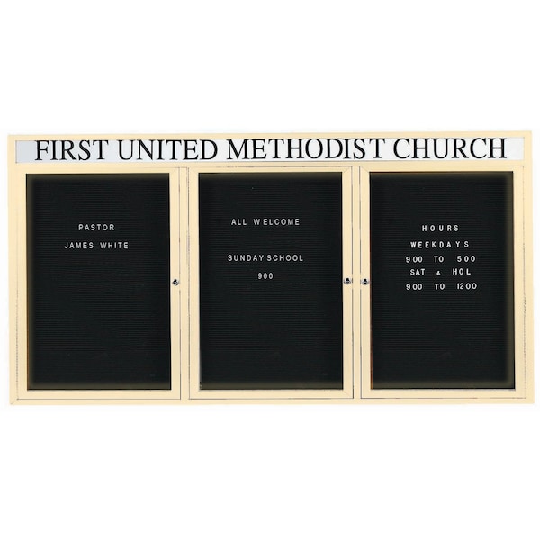 Illuminated Enclosed Aluminum Directory Boards are made of custom extruded parts engineered to provide accurate, durable and handsome cabinets. All corners are neatly mitered and assembled with Heavy duty reinforcements and fasteners. The black felt covered grooved rear panel designed to accommodate changeable letters with tabs spaced on 1/4" centers. Supplied with a blank header panel, ready for your custom vinyl lettering. Lettering is not included and must be applied by the customer. Ivory Powder Coated Finish Size 36"Hx72"W 3 Doors
