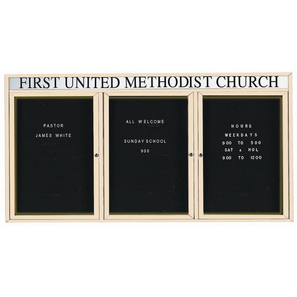Illuminated Enclosed Aluminum Directory Boards are made of custom extruded parts engineered to provide accurate, durable and handsome cabinets. All corners are neatly mitered and assembled with Heavy duty reinforcements and fasteners. The black felt covered grooved rear panel designed to accommodate changeable letters with tabs spaced on 1/4" centers. Supplied with a blank header panel, ready for your custom vinyl lettering. Lettering is not included and must be applied by the customer. Ivory Powder Coated Finish Size 48"Hx96"W 3 Doors