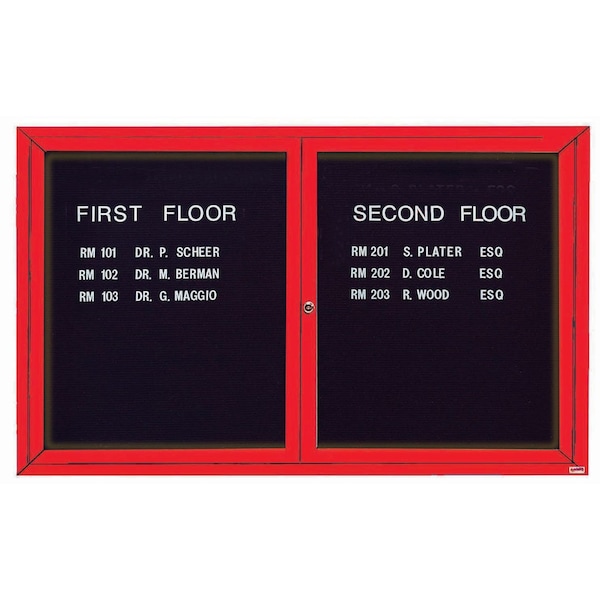 Illuminated Enclosed Aluminum Directory Boards are made of custom extruded parts engineered to provide accurate, durable and handsome cabinets. All corners are neatly mitered and assembled with Heavy duty reinforcements and fasteners. The black felt covered grooved rear panel designed to accommodate changeable letters with tabs spaced on 1/4" centers. Red Powder Coated Finish Size 36"Hx60"W 2 Doors