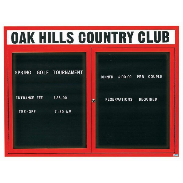Illuminated Enclosed Aluminum Directory Boards are made of custom extruded parts engineered to provide accurate, durable and handsome cabinets. All corners are neatly mitered and assembled with Heavy duty reinforcements and fasteners. The black felt covered grooved rear panel designed to accommodate changeable letters with tabs spaced on 1/4" centers. Supplied with a blank header panel, ready for your custom vinyl lettering. Lettering is not included and must be applied by the customer. Red Powder Coated Finish Size 48"Hx60"W 2 Doors