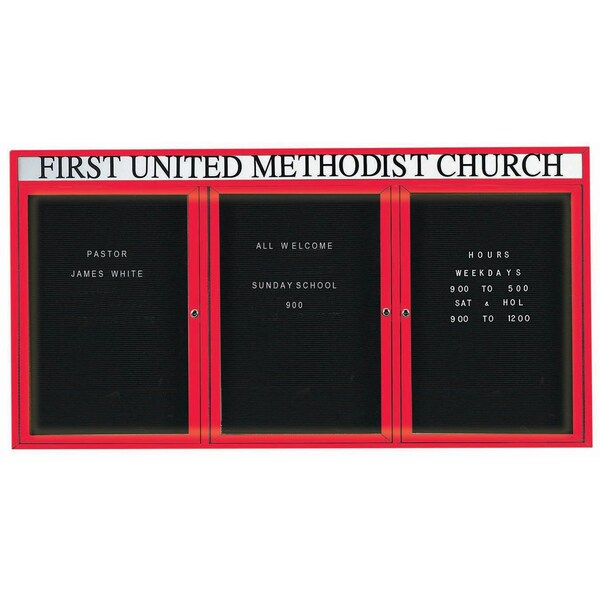 Illuminated Enclosed Aluminum Directory Boards are made of custom extruded parts engineered to provide accurate, durable and handsome cabinets. All corners are neatly mitered and assembled with Heavy duty reinforcements and fasteners. The black felt covered grooved rear panel designed to accommodate changeable letters with tabs spaced on 1/4" centers. Supplied with a blank header panel, ready for your custom vinyl lettering. Lettering is not included and must be applied by the customer. Red Powder Coated Finish Size 48"Hx96"W 3 Doors