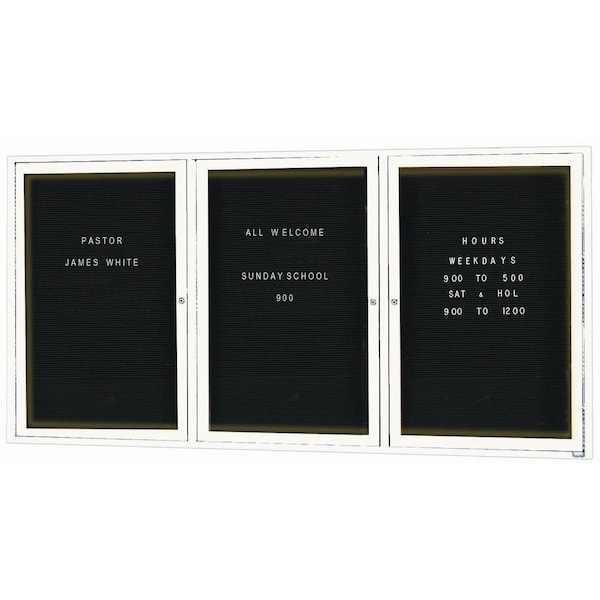 Illuminated Enclosed Aluminum Directory Boards are made of custom extruded parts engineered to provide accurate, durable and handsome cabinets. All corners are neatly mitered and assembled with Heavy duty reinforcements and fasteners. The black felt covered grooved rear panel designed to accommodate changeable letters with tabs spaced on 1/4" centers. White Powder Coated Finish Size 36"Hx72"W 3 Doors