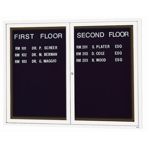 Illuminated Enclosed Aluminum Directory Boards are made of custom extruded parts engineered to provide accurate, durable and handsome cabinets. All corners are neatly mitered and assembled with Heavy duty reinforcements and fasteners. The black felt covered grooved rear panel designed to accommodate changeable letters with tabs spaced on 1/4" centers. White Powder Coated Finish Size 48"Hx60"W 2 Doors