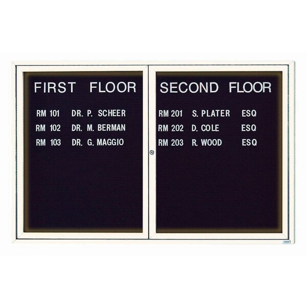 Illuminated Enclosed Aluminum Directory Boards are made of custom extruded parts engineered to provide accurate, durable and handsome cabinets. All corners are neatly mitered and assembled with Heavy duty reinforcements and fasteners. The black felt covered grooved rear panel designed to accommodate changeable letters with tabs spaced on 1/4" centers. White Powder Coated Finish Size 48"Hx72"W 2 Doors