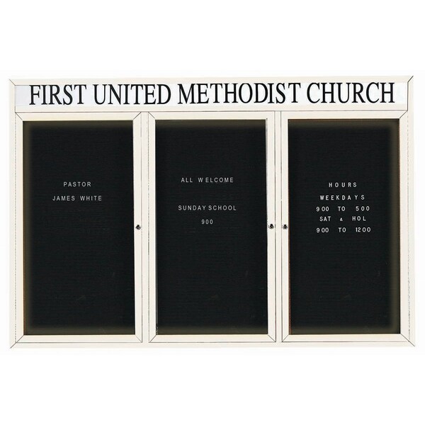 Illuminated Enclosed Aluminum Directory Boards are made of custom extruded parts engineered to provide accurate, durable and handsome cabinets. All corners are neatly mitered and assembled with Heavy duty reinforcements and fasteners. The black felt covered grooved rear panel designed to accommodate changeable letters with tabs spaced on 1/4" centers. Supplied with a blank header panel, ready for your custom vinyl lettering. Lettering is not included and must be applied by the customer. White Powder Coated Finish Size 48"Hx72"W 3 Doors