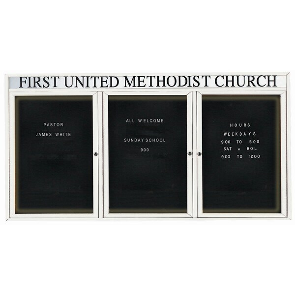 Illuminated Enclosed Aluminum Directory Boards are made of custom extruded parts engineered to provide accurate, durable and handsome cabinets. All corners are neatly mitered and assembled with Heavy duty reinforcements and fasteners. The black felt covered grooved rear panel designed to accommodate changeable letters with tabs spaced on 1/4" centers. Supplied with a blank header panel, ready for your custom vinyl lettering. Lettering is not included and must be applied by the customer. White Powder Coated Finish Size 48"Hx96"W 3 Doors