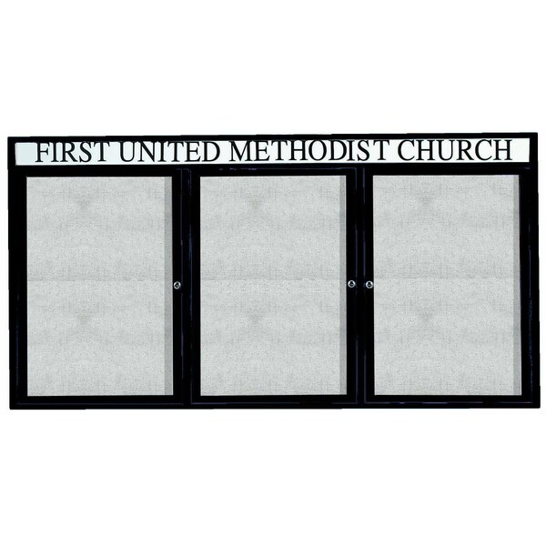 Illuminated Outdoor Enclosed Aluminum Bulletin Boards are made of custom extruded parts engineered to provide accurate, durable and handsome cabinets. All corners are neatly mitered and assembled with Heavy duty reinforcements and fasteners. Units are weatherized. Back panel is an attractive standard vinyl. Supplied with a blank header panel, ready for your custom vinyl lettering. Lettering is not included and must be applied by the customer. Finish Bronze Satin Anodized Size 36"Hx72"W 3 Doors