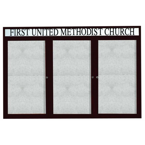 Illuminated Outdoor Enclosed Aluminum Bulletin Boards are made of custom extruded parts engineered to provide accurate, durable and handsome cabinets. All corners are neatly mitered and assembled with Heavy duty reinforcements and fasteners. Units are weatherized. Back panel is an attractive standard vinyl. Supplied with a blank header panel, ready for your custom vinyl lettering. Lettering is not included and must be applied by the customer. Finish Bronze Satin Anodized Size 48"Hx72"W 3 Doors