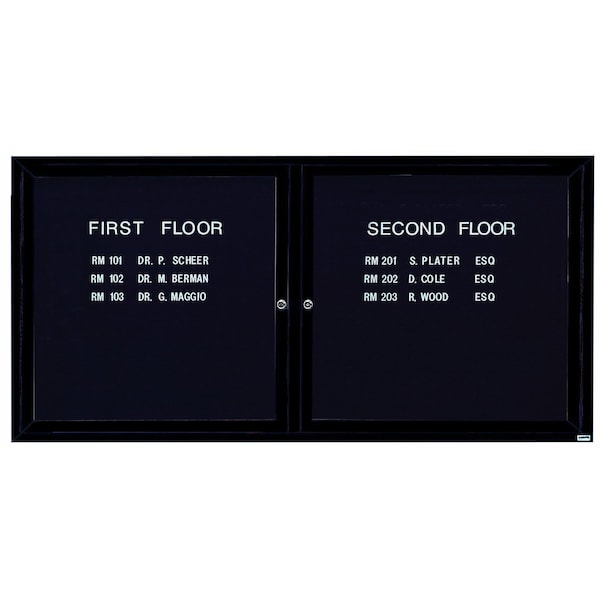 Illuminated Outdoor Enclosed Aluminum Directory Boards are made of custom extruded parts engineered to provide accurate, durable and handsome cabinets. All corners are neatly mitered and assembled with Heavy duty reinforcements and fasteners. The black vinyl covered grooved rear panel designed to accommodate changeable letters with tabs spaced on 1/4" centers. Finish Clear Satin Anodized Size 36"Hx72"W 2 Doors
