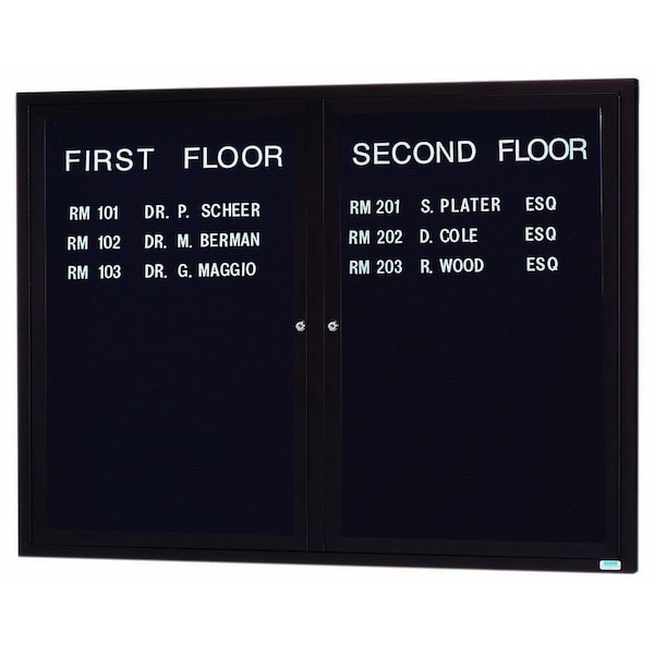 Illuminated Outdoor Enclosed Aluminum Directory Boards are made of custom extruded parts engineered to provide accurate, durable and handsome cabinets. All corners are neatly mitered and assembled with Heavy duty reinforcements and fasteners. The black vinyl covered grooved rear panel designed to accommodate changeable letters with tabs spaced on 1/4" centers. Finish Bronze Satin Anodized Size 48"Hx60"W 2 Doors