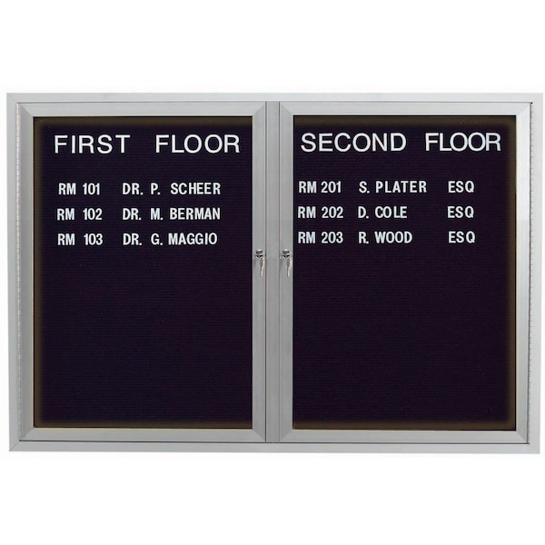 Illuminated Outdoor Enclosed Aluminum Directory Boards are made of custom extruded parts engineered to provide accurate, durable and handsome cabinets. All corners are neatly mitered and assembled with Heavy duty reinforcements and fasteners. The black vinyl covered grooved rear panel designed to accommodate changeable letters with tabs spaced on 1/4" centers.. Finish Clear Satin Anodized Size 36"Hx48"W 2 Doors