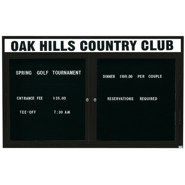 Illuminated Outdoor Enclosed Aluminum Directory Boards are made of custom extruded parts engineered to provide accurate, durable and handsome cabinets. All corners are neatly mitered and assembled with Heavy duty reinforcements and fasteners. The black vinyl covered grooved rear panel designed to accommodate changeable letters with tabs spaced on 1/4" centers. Supplied with a blank header panel, ready for your custom vinyl lettering. Lettering is not included and must be applied by the customer. Finish Bronze Satin Anodized Size 48"Hx72"W 2 Doors