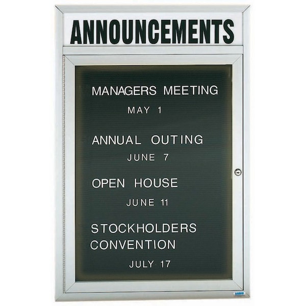 Illuminated Outdoor Enclosed Aluminum Directory Boards are made of custom extruded parts engineered to provide accurate, durable and handsome cabinets. All corners are neatly mitered and assembled with Heavy duty reinforcements and fasteners. The black vinyl covered grooved rear panel designed to accommodate changeable letters with tabs spaced on 1/4" centers. Supplied with a blank header panel, ready for your custom vinyl lettering. Lettering is not included and must be applied by the customer. Finish Clear Satin Anodized Size 36"Hx24"W 1 Door