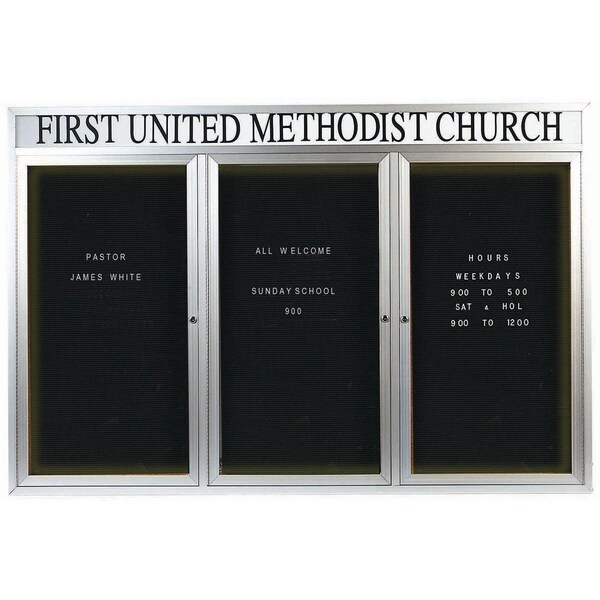 Illuminated Outdoor Enclosed Aluminum Directory Boards are made of custom extruded parts engineered to provide accurate, durable and handsome cabinets. All corners are neatly mitered and assembled with Heavy duty reinforcements and fasteners. The black vinyl covered grooved rear panel designed to accommodate changeable letters with tabs spaced on 1/4" centers. Supplied with a blank header panel, ready for your custom vinyl lettering. Lettering is not included and must be applied by the customer. Finish Clear Satin Anodized Size 48"Hx72"W 3 Doors