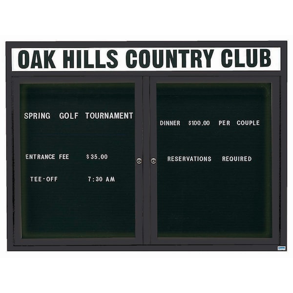 Illuminated Outdoor Enclosed Aluminum Directory Boards are made of custom extruded parts engineered to provide accurate, durable and handsome cabinets. All corners are neatly mitered and assembled with Heavy duty reinforcements and fasteners. The black vinyl covered grooved rear panel designed to accommodate changeable letters with tabs spaced on 1/4" centers. Supplied with a blank header panel, ready for your custom vinyl lettering. Lettering is not included and must be applied by the customer. Black Powder Coated Finish Size 48"Hx60"W 2 Doors