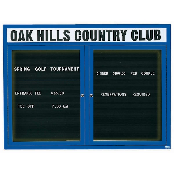 Illuminated Outdoor Enclosed Aluminum Directory Boards are made of custom extruded parts engineered to provide accurate, durable and handsome cabinets. All corners are neatly mitered and assembled with Heavy duty reinforcements and fasteners. The black vinyl covered grooved rear panel designed to accommodate changeable letters with tabs spaced on 1/4" centers. Supplied with a blank header panel, ready for your custom vinyl lettering. Lettering is not included and must be applied by the customer. Blue Powder Coated Finish Size 48"Hx60"W 2 Doors
