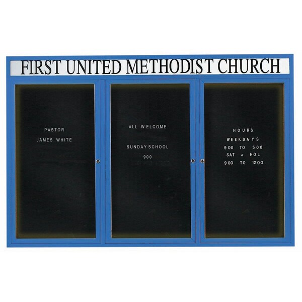 Illuminated Outdoor Enclosed Aluminum Directory Boards are made of custom extruded parts engineered to provide accurate, durable and handsome cabinets. All corners are neatly mitered and assembled with Heavy duty reinforcements and fasteners. The black vinyl covered grooved rear panel designed to accommodate changeable letters with tabs spaced on 1/4" centers. Supplied with a blank header panel, ready for your custom vinyl lettering. Lettering is not included and must be applied by the customer. Blue Powder Coated Finish Size 48"Hx72"W 3 Doors