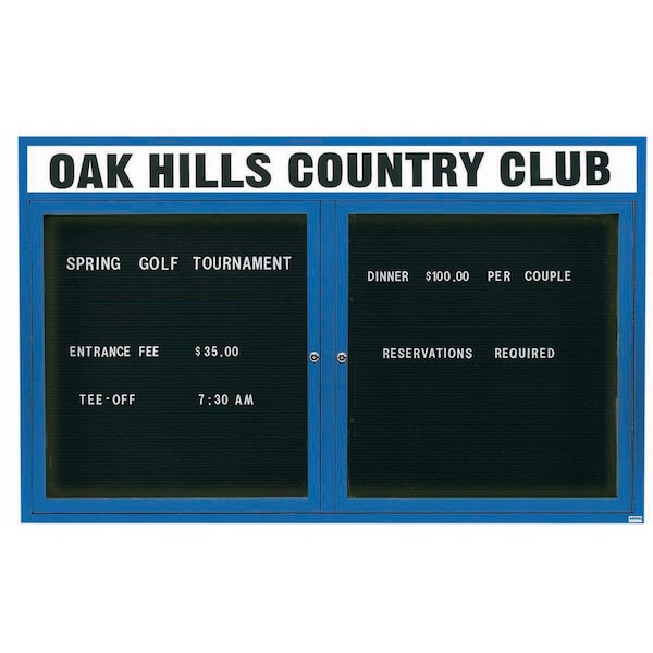 Illuminated Outdoor Enclosed Aluminum Directory Boards are made of custom extruded parts engineered to provide accurate, durable and handsome cabinets. All corners are neatly mitered and assembled with Heavy duty reinforcements and fasteners. The black vinyl covered grooved rear panel designed to accommodate changeable letters with tabs spaced on 1/4" centers. Supplied with a blank header panel, ready for your custom vinyl lettering. Lettering is not included and must be applied by the customer. Blue Powder Coated Finish Size 48"Hx72"W 2 Doors